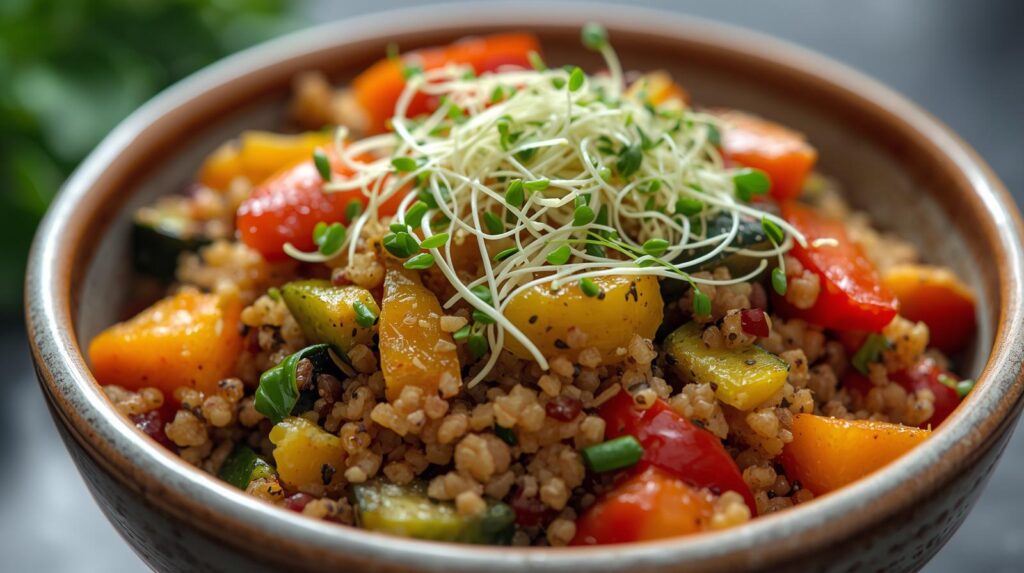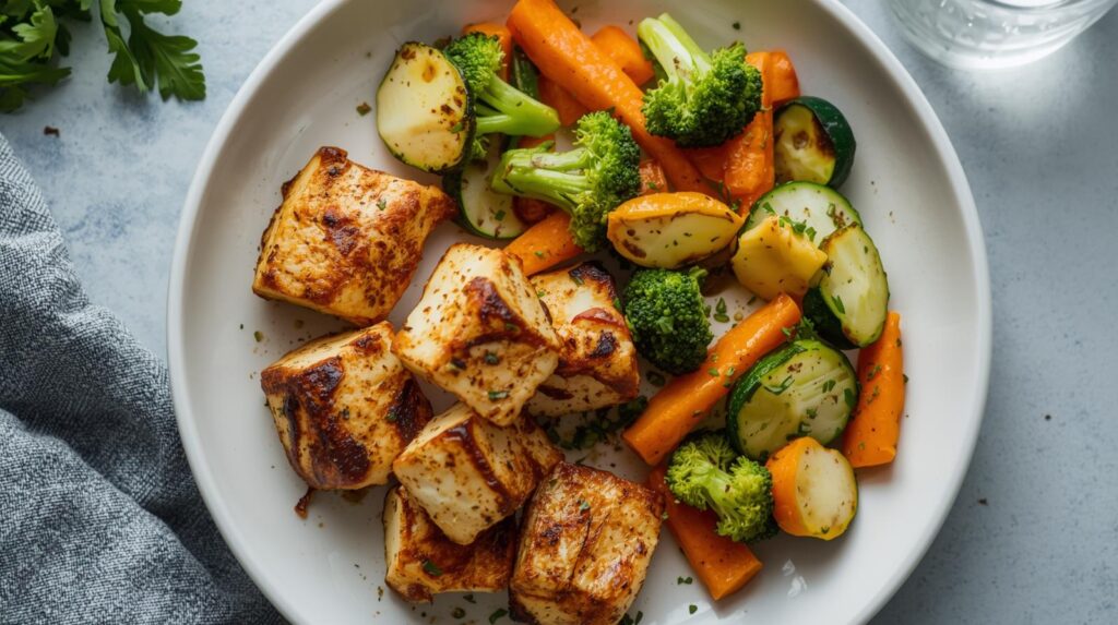 Vegetarian Veg Oats Upma Oats cooked with carrots, peas, beans, and mild spices. Light, filling, and fiber-rich. Paneer Stuffed Multigrain Sandwich Grated paneer with capsicum and herbs in multigrain bread. Paneer Bhurji with Brown Rice Low-oil paneer bhurji served with brown rice and salad. Dal, Roti & Veg Sabzi Yellow dal, one multigrain roti, and seasonal sautéed vegetables. Veg Quinoa Bowl Quinoa with roasted vegetables, sprouts, and lemon dressing. Grilled Paneer with Veggies Grilled paneer cubes with broccoli, beans, and carrots. Veg Stir Fry Bowl Stir-fried mushrooms, capsicum, baby corn, and beans in light seasoning. Roasted Chana Mix Dry roasted chana with peanuts and light spices. Sprouts Salad Moong sprouts with onion, tomato, cucumber, and lemon. Paneer Cubes with Herbs Soft paneer cubes sprinkled with herbs and black pepper.